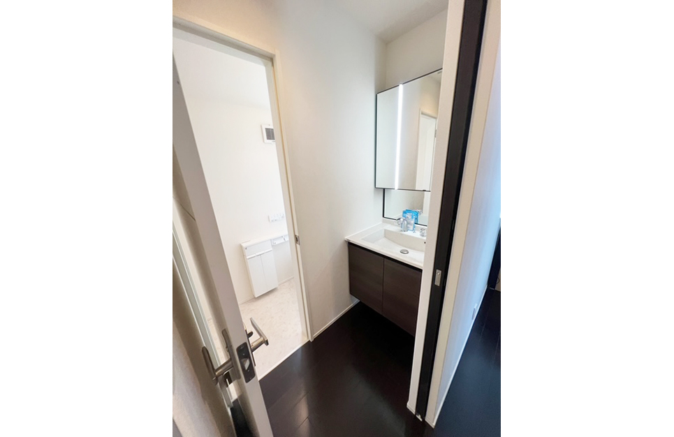 今回のリフォームでは、これまでトイレ空間の隣に位置していた収納クローゼットを大胆に解体し、広々とした洗面化粧台へと一新いたしました。