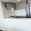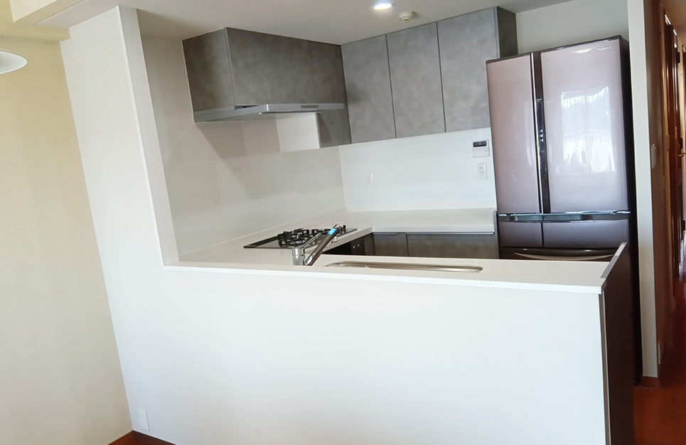 キッチンは、冷蔵庫右側の壁を撤去し、冷蔵庫設置寸法と極力合わせる形で収納を設置いたしました。下台2箇所にはコーナーキャビネットを採用し、引き出し内のオプションもご活用いただくことで、収納力を最大限に活用できるようにご提案しました。また、シンク側の袖壁および背面収納部分に、マグネットパネルをご選定いただきました。